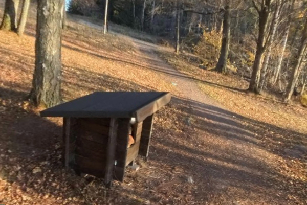 Vedförråd — Det finns ingen grillplats här. Platsen har enbart ett vedförråd, ofta beläget längs vägen till närliggande grillplatser.