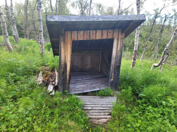 Medfaren eldstad strax intill Rallarkyrkogården. Vedförråd, utedass och bänkar att sitta på finns.
