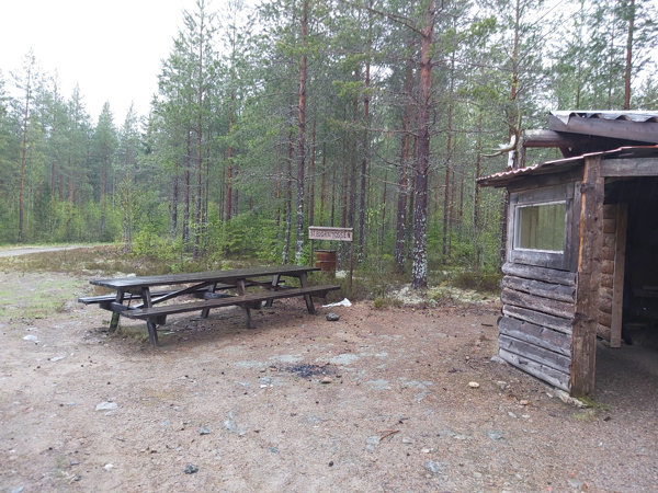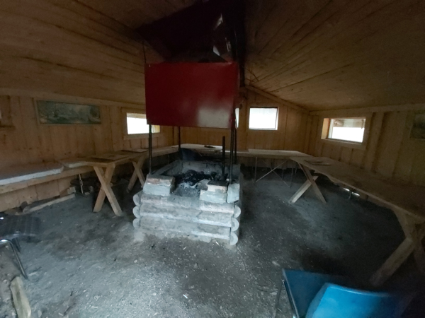 Stor rastkoja med eldstad i mitten. Skoterspår går åt alla håll från denna plats. Stort bänkbord står utanför.