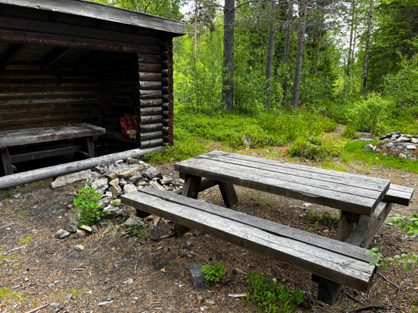 Vindskydd med eldstad i form av en stenpyramid nära Taskströmmen.