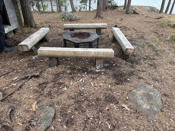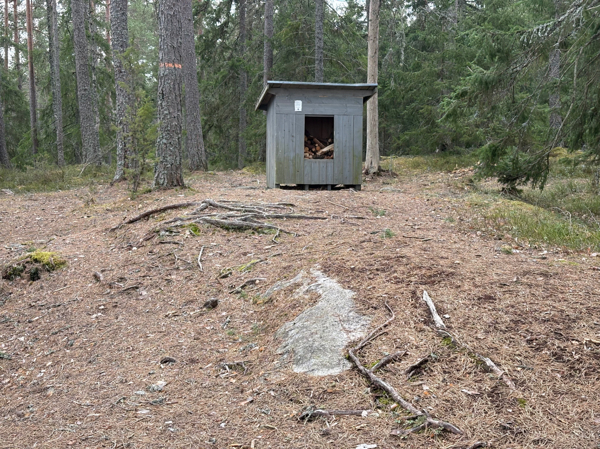 Vindskydd med grillplats efter Upplandsleden vid Tenasjön. Vindskyddet har golv och det finns en eldplats med fyra bänkar samt ett vedförråd på platsen.