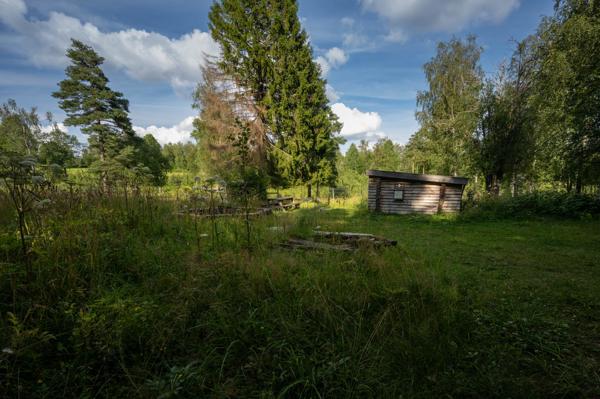 Grillplats på en gammal kaj vid Svartån. Bänkbord finns nära och vedförråd står en liten bit bort.