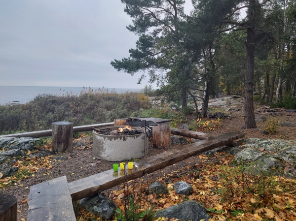 Eldstad av betong med flera bänkbord i närheten. Utsikt över vattnet.